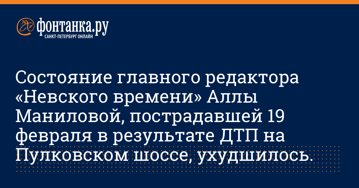Об этом нашему корреспонденту заявил заместитель главного редактора "Невского время" Михаил Соболев. В настоящее время Алла Манилова продолжает оставаться в нейрохирургическом отделении Военно-Медицинской академии, куда она была госпитализирована сразу после аварии с диагнозом "сотрясение головного мозга". Как сообщили корреспонденту агентства в справочном Военно-медицинской академии, кроме Аллы Маниловой, в клинике по-прежнему находятся Наталья Чаплина и Марина Фокина. Состояние Чаплиной и Фокиной оценивается как нормальное, а у Аллы Маниловой вчера вечером резко поднялась температура. Напомним, что 19 февраля около 12.30 на Пулковском шоссе автомобиль «Вольво», в котором находились Алла Манилова, Наталья Чаплина (главный редактор газеты «Петербургский час пик» и супруга полпреда президента на Северо-Западе Виктора Черкесова) и Марина Фокина (директор ВГТРК «Петербург», столкнулся с автомобилем ВАЗ-2109, за рулем которого была 39-летняя Марина Бердникова. Чаплина, Манилова и Фокина были госпитализированы в Военно-Медицинскую Академию. Марина Бердникова была доставлена в больницу имени Костюшко, но через несколько часов отпущена домой. Как сообщил Соболев, Алла Манилова не имеет претензий к Марине Бердниковой. Автомобиль "Вольво", в котором находились в момент аварии Манилова, Чаплина и Фокина, восстановлению не подлежит. Обследование водителя "Вольво" на содержание алкоголя в крови дало отрицательный результат. Материалы дела о ДТП в настоящий момент находятся в Главном следственном управлении Санкт-Петербурга .