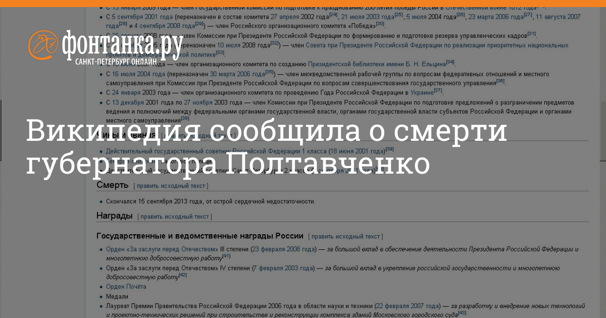 В статье Википедии, посвященной Георгию Сергеевичу Полтавченко, проставлены даты рождения и "смерти" политика: "род. 23 февраля 1953, Баку, Азербайджанская ССР - 15 сентября 2013, Санкт-Петербург, Россия". При этом указывается на то, что "причиной смерти" Георгия Сергеевича Полтавченко стала острая сердечная недостаточность.