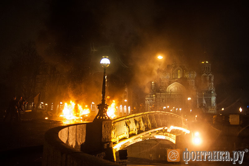 Пятеро активистов, в числе которых известный акционист Петр Павленский провели акцию в поддержку Украины в самом центре Петербурга – на Малом Конюшенном мосту напротив Спаса-на-Крови.