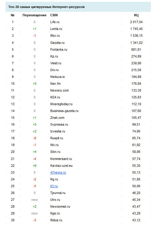 Первые четыре места в топ-30 распределились между ресурсами Life.ru (2 017,04), Lenta.ru (1 745,40), Rbc.ru (1 536,15) и Gazeta.ru (1 341,02).