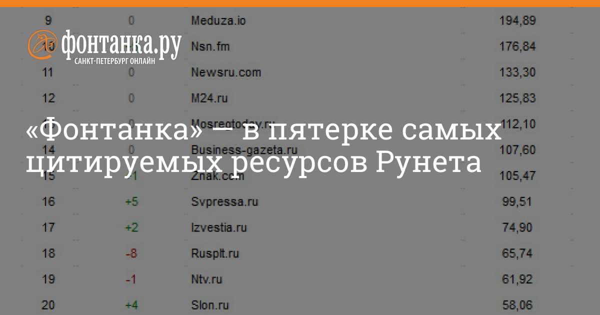 По результатам августовского исследования компании «Медиалогия» «Фонтанка» традиционно вошла в пятерку самых цитируемых интернет-СМИ России. Индекс цитируемости, который 29 сентября публикует «Медиалогия», составил у «Фонтанки» 681,81.