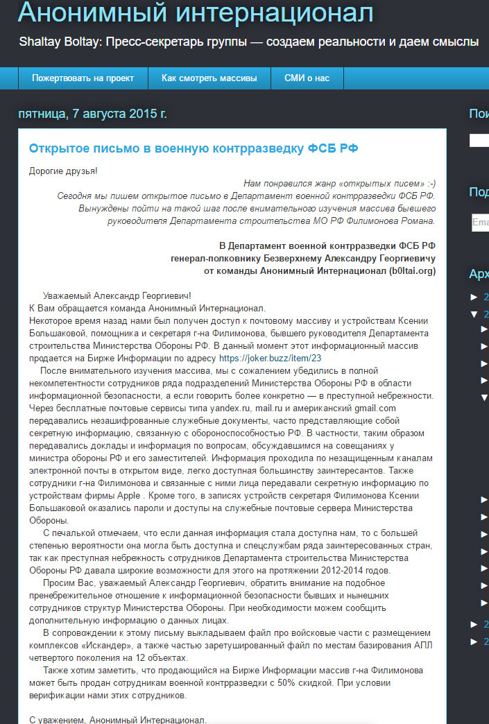 Звонок для "Шалтая-Болтая", возможно, прозвенел в августе 2015 года, когда «Анонимный интернационал» опубликовал открытое письмо главе департамента военной контрразведки генерал-полковнику Александру Безверхнему. "Шалтай-Болтай", демонстрируя озабоченность сохранностью военных секретов, опубликовал несколько писем из почтового ящика Ксении Большаковой, которая занимала должность секретаря начальника департамента строительства Минобороны Романа Филимонова, экс вице-губернатора Петербурга.