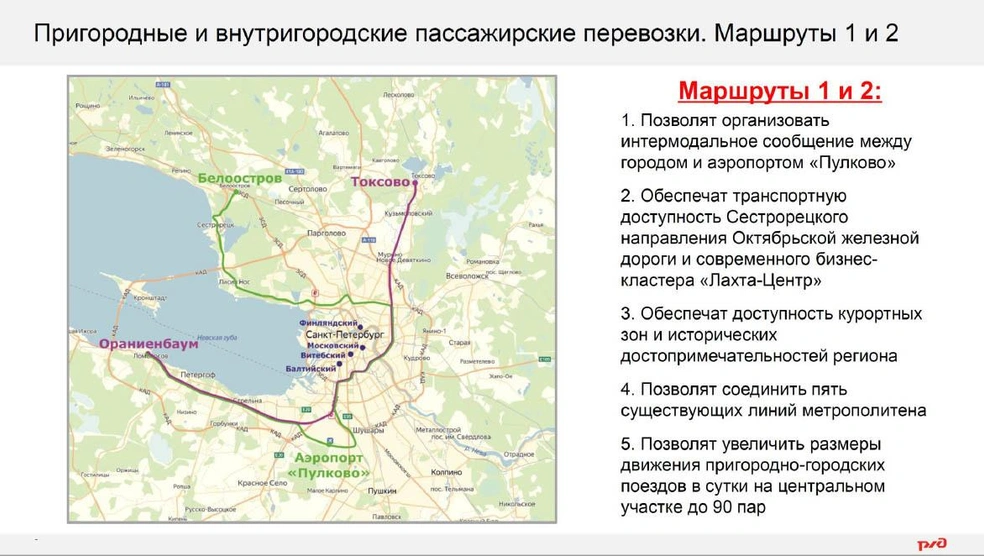 Как сообщил на совещании в Смольном 2 сентября заместитель гендиректора ОАО РЖД Олег Тони, приоритетным направлением будет организация двух новых маршрутов внутригородского движения: Ораниенбаум – Белоостров, Ораниенбаум – Токсово. Движение по первому маршруту будет организовано через аэропорт Пулково.