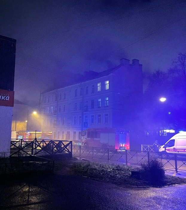 Сильный пожар тушат во Фрунзенском районе Петербурга уже несколько часов. Для размещения людей понадобился автобус.