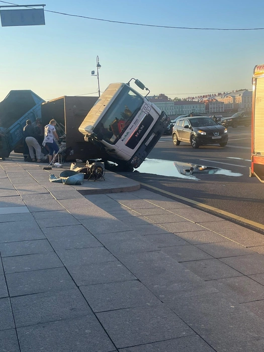 Вечером 7 августа на Адмиралтейской набережной опрокинулся мусоровоз, сообщили очевидцы в группе «ДТП и ЧП | Санкт-Петербург» во «ВКонтакте». По их словам, водитель не вписался в поворот. На место прибыли сотрудники МЧС. Очевидцы сняли на видео, как спецтехника возвращает грузовик на колеса.