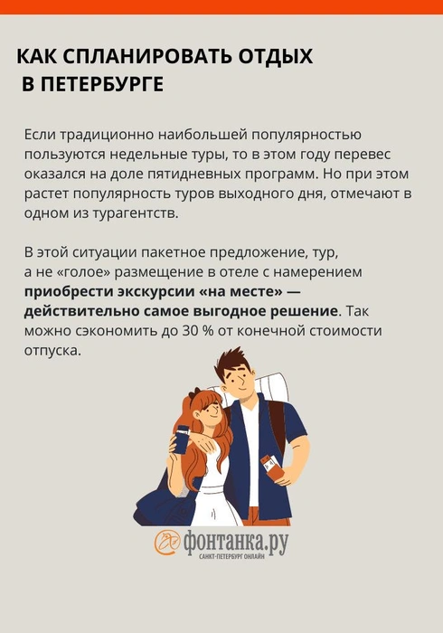 Петербург вошел в топ-3 августовских направлений, которые отечественные туристы выбирают для коротких путешествий по России. Как рассказали в комитете по туризму, наиболее популярны у гостей города на Неве туры длительностью три-четыре дня. На них приходится почти каждая третья поездка. Один из самых дешевых вариантов из регионов — пакетный автобусный тур.