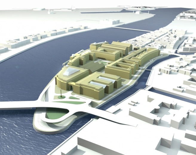 В далеком 2007 году, пожалуй, первый проект редевелопмента Ново-Адмиралтейского острова был создан студией «Урбис» за авторством архитектора Олега Харченко. Он в те годы только недавно покинул пост главного архитектора города, на котором бессменно проработал 13 лет и о тонкостях градостроительства Петербурга знал, пожалуй, лучше всех.