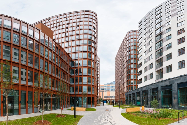 Для жилых корпусов выбраны правильные геометрические формы, штукатурные фасады с лаконичными спокойными цветами. А для гостиницы характерны закругленные формы, яркие динамичные цвета, окрашенные алюминиевые панели с нанесенной методом сублимации текстурой. Во дворе представлено авторское благоустройство и озеленение, а также современное экологичное игровое оборудование для детей — в жилой части проекта.