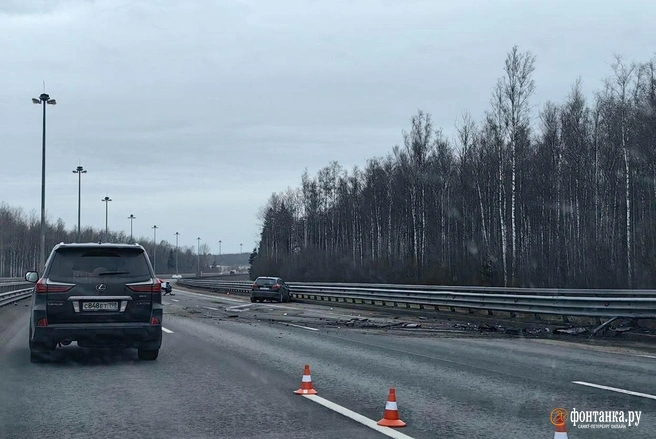 Столкновение двух автомобилей произошло на 99-м километре КАД в Ломоносовском районе Ленобласти. Машины двигались в попутном направлении, сообщает 8 марта читатель «Фонтанки».