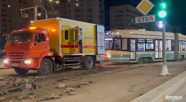 В происшествии с трамваем в Василеостровском районе Петербурга ночью 2 апреля никто не пострадал. Официальный комментарий «Фонтанке» дали в пресс-службе ГУП «Горэлектротранс». Очевидцы сняли на видео ночные работы.