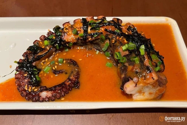 Осьминог от Красова — верх минимализма: только щупальце, соус из томатов и понзу, чуть-чуть йогурта и капелька маринованных огурцов (1390). Цена на блюдо по нынешним временам достаточно гуманна (но, скорее всего, это не навсегда), текстура у осьминога определенно хороша, но ему самому не помешало бы какое-то более серьезное сопровождение. А не только возможность заказать рис.