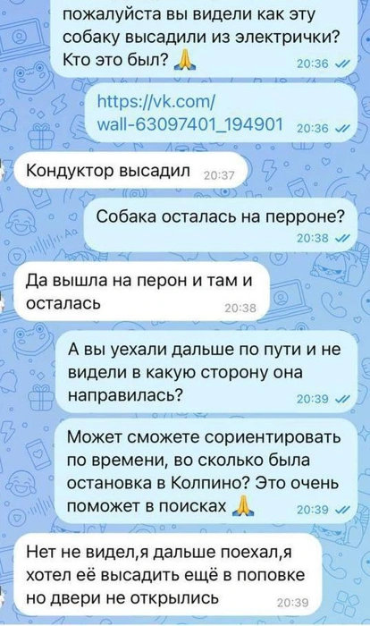 «В ходе проверки установлено, что поездная бригада соблюдала регламент работы, обеспечивала безопасность пассажиров, но не выгоняла собаку из поезда. Этот факт подтверждается записью с камер видеонаблюдения. На следующей по маршруту станции Колпино, когда в вагон стали заходить пассажиры, пёс выбежал из электрички. Нарушений в действиях поездной бригады не установлено. <…> Наши волонтеры также участвуют в поисках пропавшей собаки», — говорится в сообщении.