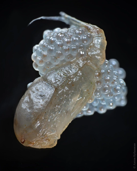 На фотографии самка циклопа с яйцами. «Откладывая яйца, она носит их с собой, а не бросает где попало», — отмечает фотограф. Конкретно этот рачок не видел динозавров, но найдены окаменелые копеподы каменноугольного периода и ранней юры. Самым древним 303 миллиона лет — это задолго до динозавров. С тех пор они практически не изменились.