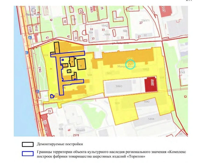 На территории «Невской мануфактуры» на Октябрьской набережной снесут семь зданий, которые не входят в границы памятника «Комплекс построек фабрики Товарищества шерстяных изделий „Торнтон“» и не являются объектами культурного наследия. Это следует из акта государственной историко-культурной экспертизы, опубликованной 7 апреля на сайте КГИОП.