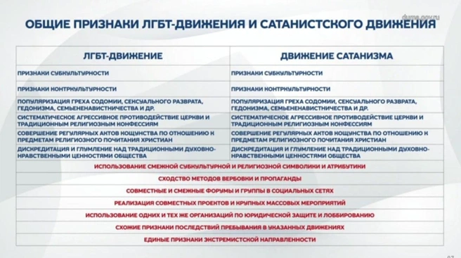 Иерей Федор, представляющий патриаршую комиссию по вопросам материнства и детства, добавил, что сатанизм связан с запрещенным движением ЛГБТ* и его нужно побороть точно так же, запретив. Он также заявил, что в США есть клиника, где делают аборты, при этом читая сатанинские мантры. Его поддержал иерей Питирим, заявив, что «когда запретили ЛГБТ, мы начали побеждать». «Теперь надо принять защиту против бесовщины, против психологов, тогда мы победим», — уверен он. По словам представителя РПЦ, чаще всего втягивают в подобные ритуалы женщин. Например, утверждает представитель РПЦ, женщины рассказывали ему, что в клинике (он назвал одну из известных организаций, где предлагают услуги по снижению веса) тех дам, которые пришли туда, чтобы похудеть, якобы просили дышать по собачьи, вгоняя в транс.