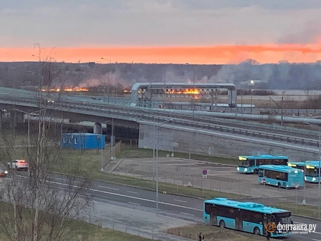 Снимки мощного пламени на пустыре рядом с Приморским шоссе шлют этим вечером читатели «Фонтанки». Очевидцы заметили подбирающиеся к очагу пожарные машины.