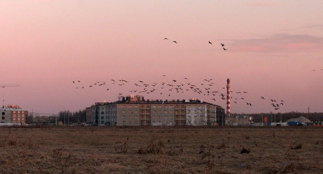 «За пару часов у меня на глазах количество отдыхающих гусей выросло до полутысячи, не меньше. Гуси остановились вблизи жилых домов — значит, чувствуют себя в безопасности рядом с людьми», — отмечает Павел Глазков.