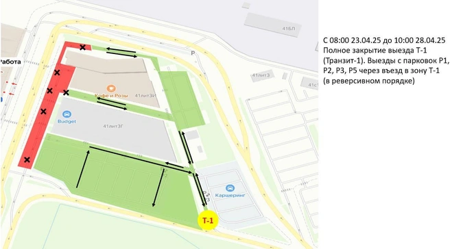 С 8 часов среды из-за строительных работ закроют выезд в зоне «Транзит-1». Водители смогут выезжать через въезд в «Транзинт-1» в реверсивном порядке. Ориентировочно ограничения продлятся до 28 апреля.