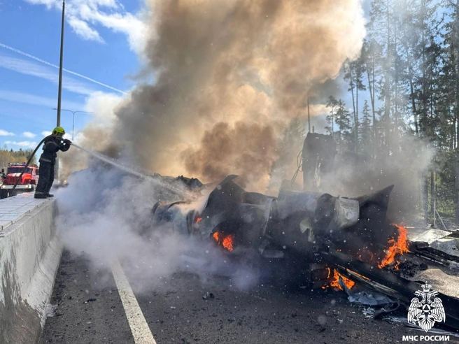 Серьезная авария остановила движение по платной трассе М-11 «Нева» (Москва — Петербург) в Тверской области. ДТП переросло в пожар. МЧС показало кадры с места происшествия.
