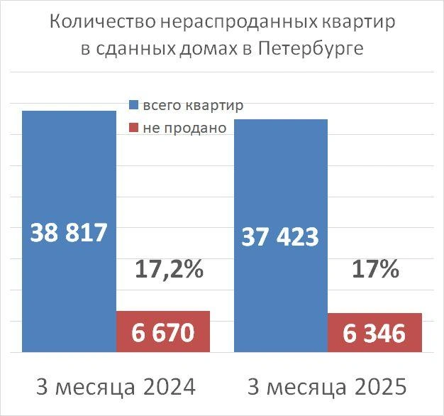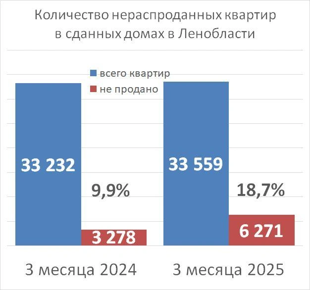 Профильное агентство Dataflat.ru по просьбе «Фонтанки» провело подсчеты нераспроданных квартир в уже построенных домах. В среднем по стране этот показатель за пять лет вырос с 25% до 47% в марте 2025 года. А только за последний год рост составил 15% — как раз на фоне охлаждения рынка, инициированного стараниями Центробанка.