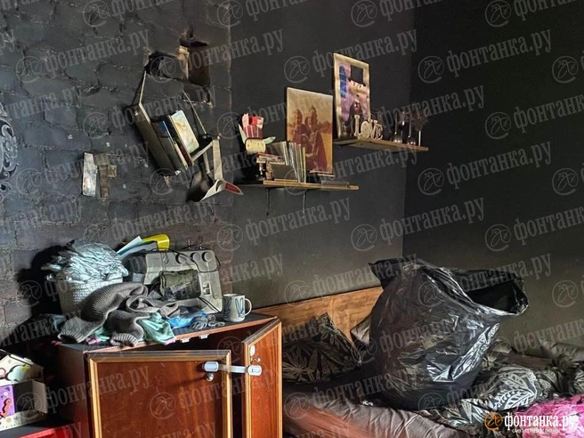 В распоряжении «Фонтанки» оказались снимки после пожара в квартире на третьем этаже по адресу: Исполкомская, 5. По нашим данным, пожар охватил пятикомнатную квартиру. В одной из комнат была натянута надпись: «Кофейку бахнем — и норм».