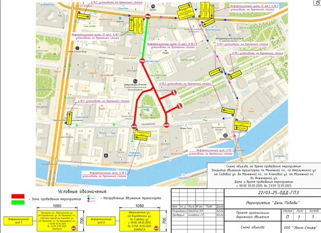 Также с 00:00 8 мая до 23:59 10 мая будет закрыто движение транспорта на Итальянской улице от Манежной площади до Садовой улицы и на Кленовой улице от Инженерной улицы до Манежной площади.