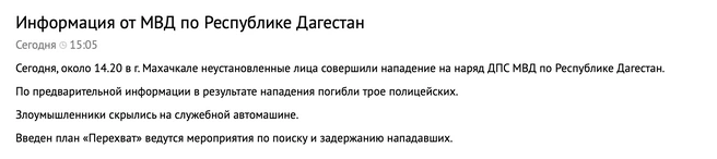В результате нападения на наряд ДПС в столице Дагестана Махачкале, произошедшего в понедельник, 5 мая, погибли трое человек и еще пятеро получили ранения. Об этом сообщили республиканские МВД и минздрав.