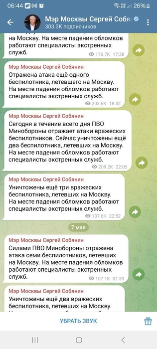 В 01:33 он рассказал об отражении атаки семи БПЛА, а в 3:55 — ещё двух. «На месте падения обломков работают специалисты экстренных служб», — отмечается в сообщениях. Прошлой ночью столицу атаковали 19 украинских дронов. Затем вечером, начиная с 17:38, Собянин выдал четыре подряд поста о новой атаке, которая продолжалась и ночью.