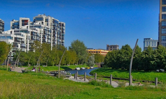 В Красногвардейском районе можно побывать на набережных рек Охты и Оккервиль. В сквере у места их слияния есть скамейки, качели и детская площадка.