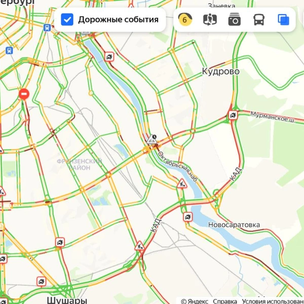 Загруженность дорог Петербурга 19 мая к 8:30 достигла 6 баллов по шкале «Яндекса», что на 1 балл больше обычного для этого времени в понедельник.