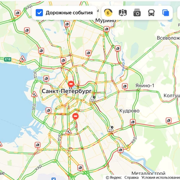 Также крупные пробки «Яндекс» фиксирует на Колтушском шоссе и проспекте Косыгина (4,6 км, можно потерять 1 час 1 минуту) и на Мурманском шоссе (5,9 км).