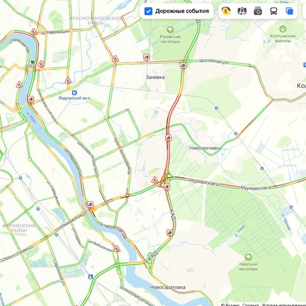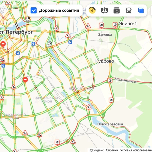 После 11 часов пробки на КАД стали рассасываться, и общая загруженность дорог Петербурга снизилась с 5 до обычных для этого времени 4 баллов по шкале «Яндекса».