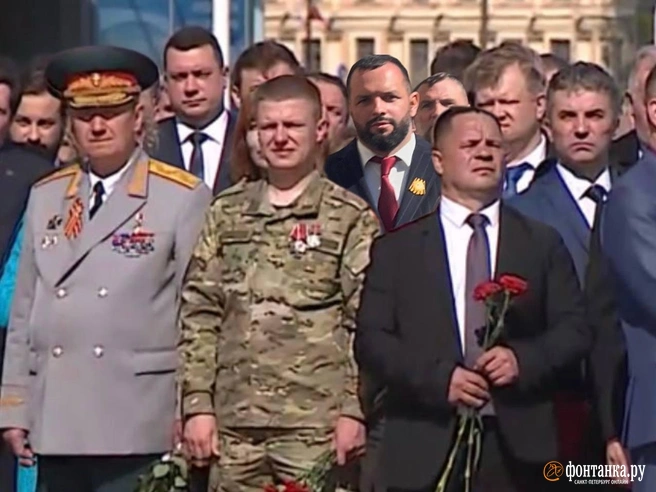 Фотографию с церемонии возложения цветов к Медному всаднику опубликовали 27 мая в социальных сетях комитета имущественных отношений Петербурга. Председатель ведомства Владимир Уваров оказался вклеен по центру кадра.