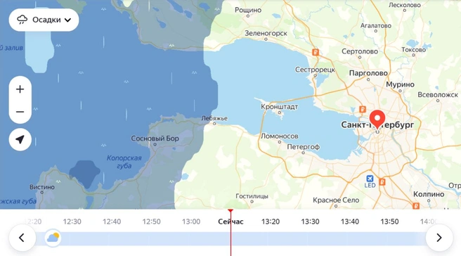 В пятницу, напомним, в Петербурге действует «жёлтый» уровень погодной опасности в связи с ожидающимися дождем, ветром и грозой. Атмосферный фронт с осадками движется на нас с запада. Судя по «Яндекс.Погоде», он уже накрыл Сосновый Бор и подходит к Лебяжьему на юге и Зеленогорску на севере.