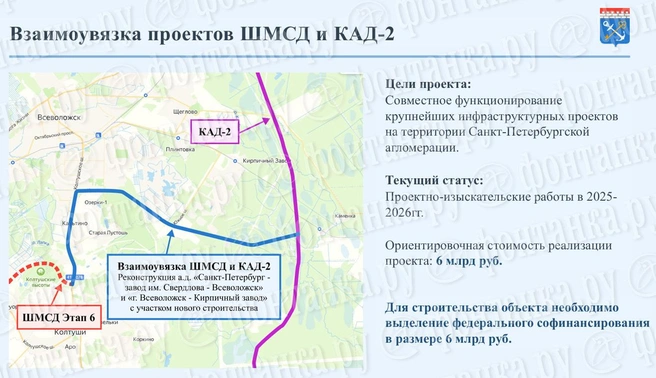 Со временем с федеральных высот прозвучало, что ШМСД — все же приоритет, но к тому времени уже все согласились, что их будут увязывать. Как именно — обсуждается. Изначально предполагалось это делать через Мурманское шоссе, однако прошлым летом представили другой проект — по модернизации существующей сети региональных дорог Санкт-Петербург — завод им. Свердлова — Всеволожск и Всеволожск — Кирпичный завод с достройкой недостающего участка.