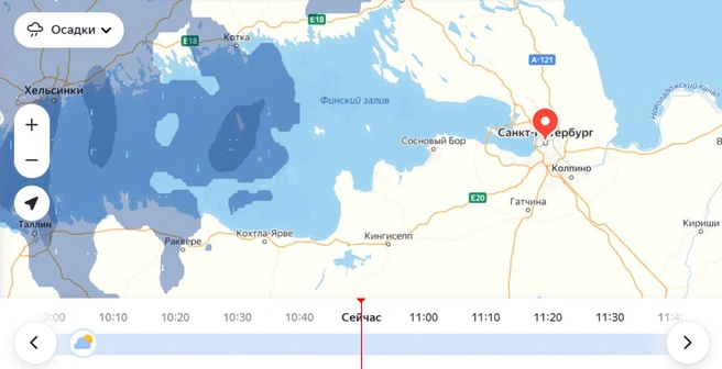 Зона осадков хорошо видна на «Яндекс.Карте». Сейчас она находится над Таллином и Хельсинки и тянется по Финскому заливу к Петербургу.