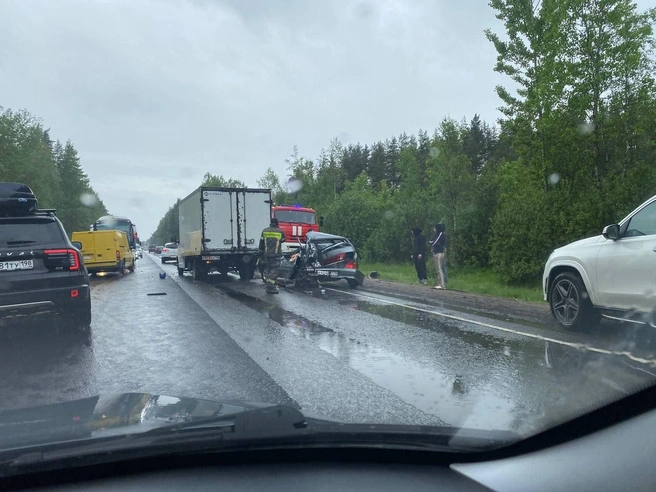 ГАИ проводит проверку по факту аварии на 85-м километре Мурманского шоссе в Кировском районе Ленобласти. Утром 8 июня там столкнулись бензовоз, «Лада» и «Газель». Фотографии с места ДТП появились в соцсетях.