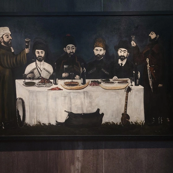 Выставка «Традиции. Нико Пиросмани. Зураб Церетели» в парадных залах Музея Академии художеств посвящена художникам, Грузии и — возможно больше всего — жизненной силе, которую невозможно сымитировать. Здесь цвета земли, вина, гор и снежных шапок на них (черный, бордо, лиловый, серый, белый) рифмуются со скатертями на длинных столах, которые будто приглашают присоединиться к пиру. Не сказать, что концепция новаторская или интеллектуально извилистая, но зрительский успех тут, кажется, обеспечен.