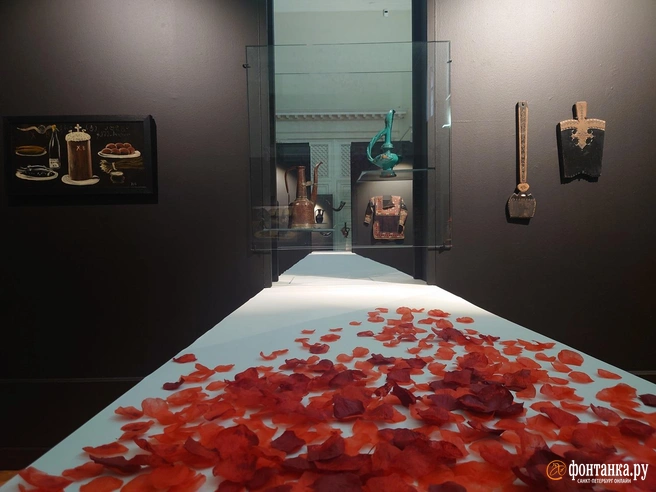 А дальше вы знаете: Андрей Вознесенский написал стихотворение «Миллион роз», Алла Пугачёва записала песню. В честь легендарного жеста Пиросмани в Тициановском зале Музея Академии с потолка будто летят розовые лепестки, ими же усыпаны столы по центру. Выставка Нико Пиросмани (1862 — 1918) и Зураба Церетели (1934 — 2025) вообще местами доходчивая до буквальности, но материал такой подход совершенно не портит. В Рафаэлевском зале (из круглого конференц-зала налево) показывают работы Зураба Константиновича из семейного собрания, в Тициановском — также вещи Церетели и восемнадцать работ Пиросмани из российских музеев. Немного, но привезти что-либо из Грузии сейчас невозможно. Сопровождают живопись и скульптуру предметы быта, изящные этнографические детали, у которых, само собой, есть свои красивые легенды.