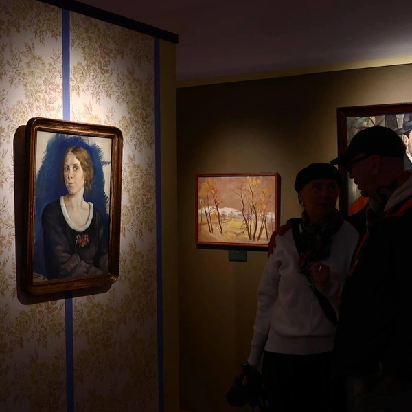 Пронзительные камерные вещи вроде портретов Георгия Верейского здесь чередуются с более крупными, как портрет Мстислава Добужинского кисти Бориса Григорьева 1917 года. А воздушные игривые «Молодожёны» того же Григорьева 1913 года — с меланхоличными, будто тающими пейзажами («Царское Село. Грот», 1910-е, Серебряковой, «Вилла Боргезе», 1908, Анны Остроумовой-Лебедевой). Оформление Антона Горланова сочетает не по-петербургски тёплые персиково-коралловые цвета с ненавязчивыми винтажными «обоями».