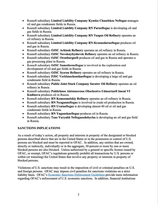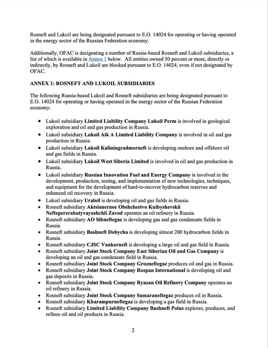 Новые санкции направлены не только на «Роснефть» и «Лукойл», которые теперь включены в санкционный список, но и на ряд из их 34 дочерних компаний.