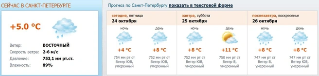 По прогнозу ФГБУ «Северо-Западное управление по гидрометеорологии и мониторингу окружающей среды», 24 октября в городе облачная, днем с прояснениями погода. В начале дня небольшой, местами умеренный дождь. Днем местами небольшой дождь. Ветер юго-восточный умеренный. Температура воздуха в 6 часов утра +5 градусов, днем +7… +9 градусов. Атмосферное давление будет понижаться.