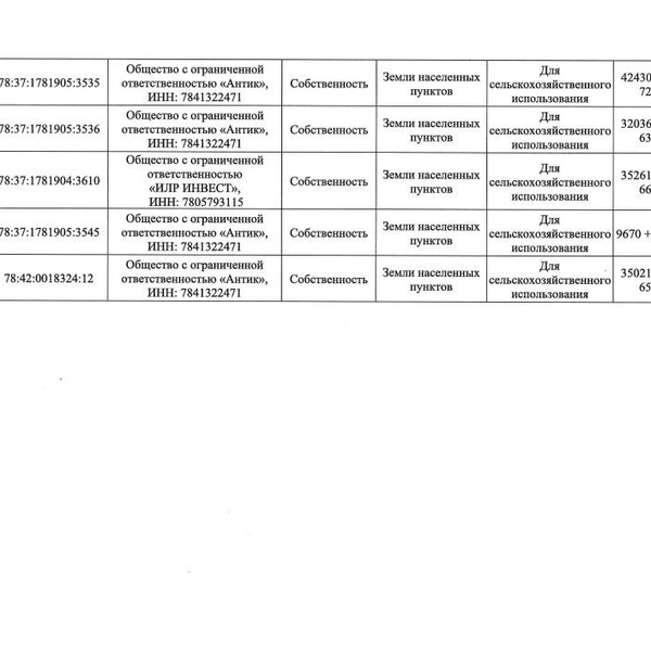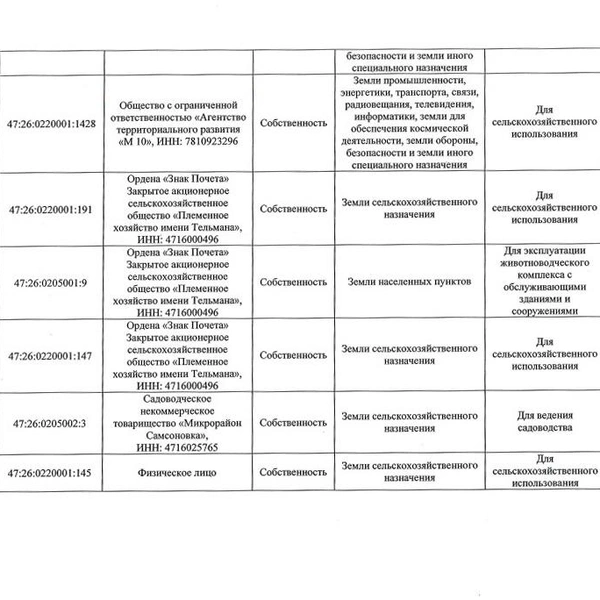 Кроме племенного хозяйства в распоряжении значатся Агентство территориального развития «М 10» и физлица. Сами участки недалеко от Ям-Ижорского шоссе и М-11.