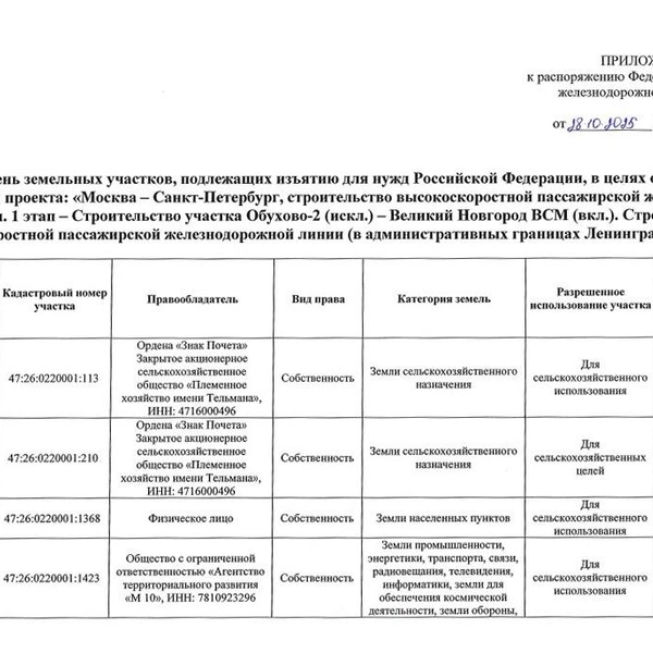 Эти компании уже попадали под изъятие земли для ВСМ. Одновременно аналогичное распоряжение было выпущено по участкам в Ленобласти. Оно касается по большей части земель племхозяйства им. Тельмана. Оно тоже регулярно оказывается в распоряжениях Росжелдора по ВССМ и уже начало судиться с концессионером по строительству магистрали.