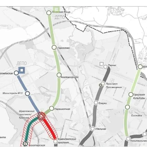 Так что в итоге проект планировки разработали с двумя станциями: «Магистраль 31» на Дороге в Каменку и «Коломяжская» рядом с Парашютной.