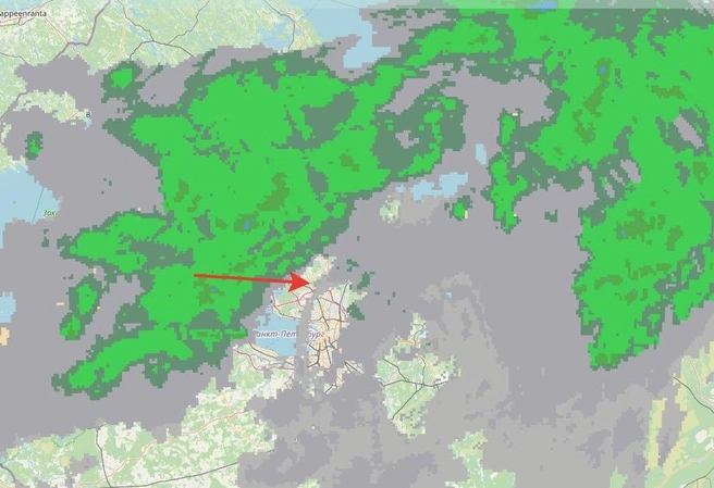 Дождя в Петербурге пока немного: на севере до 1-2 мм, на юге меньше. Но он ожидается большую часть дня, его будет выносить с акватории Финского залива отдельными зонами.
