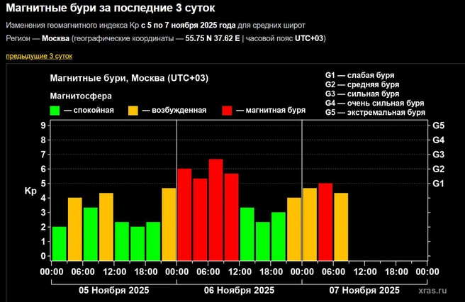 В 6 часов утра 7 ноября была зафиксирована магнитная буря G1, то есть слабая, а в 6:45 интенсивность упала до уровня геомагнитных возмущений. Об этом сообщается на сайте лаборатории солнечной астрономии ИКИ РАН.