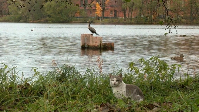 Бакланом в Сестрорецке заинтересовались не только люди, но и животные: к нему присматривается местный кот. Об этом биолог Павел Глазков рассказывает 7 ноября в своем канале «Каждой твари по паре».