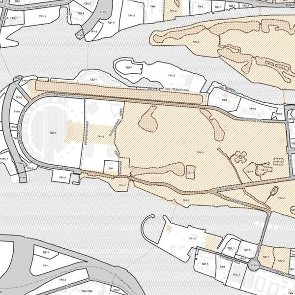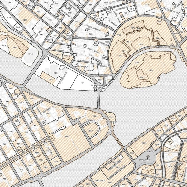 Если посмотреть на действующие правила землепользования и застройки, то видно, что вся прибрежная полоса на Петровском — это рекреация. Справа от моста — зона объектов туризма и санаторно-курортного лечения, гостиниц, пансионатов и всего остального для отдыха граждан (ТР3-2). Слева — зеленых насаждений на территории водоохранных зон (ТР5-1).