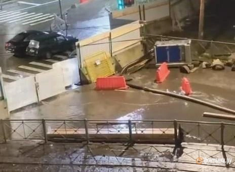 На углу улицы Харченко и 1-го Муринского проспекта вечером 7 ноября случился потоп, сообщает читатель «Фонтанки». На кадрах видно, что проезжая часть улицы Харченко, отгороженной сейчас забором, залита водой.